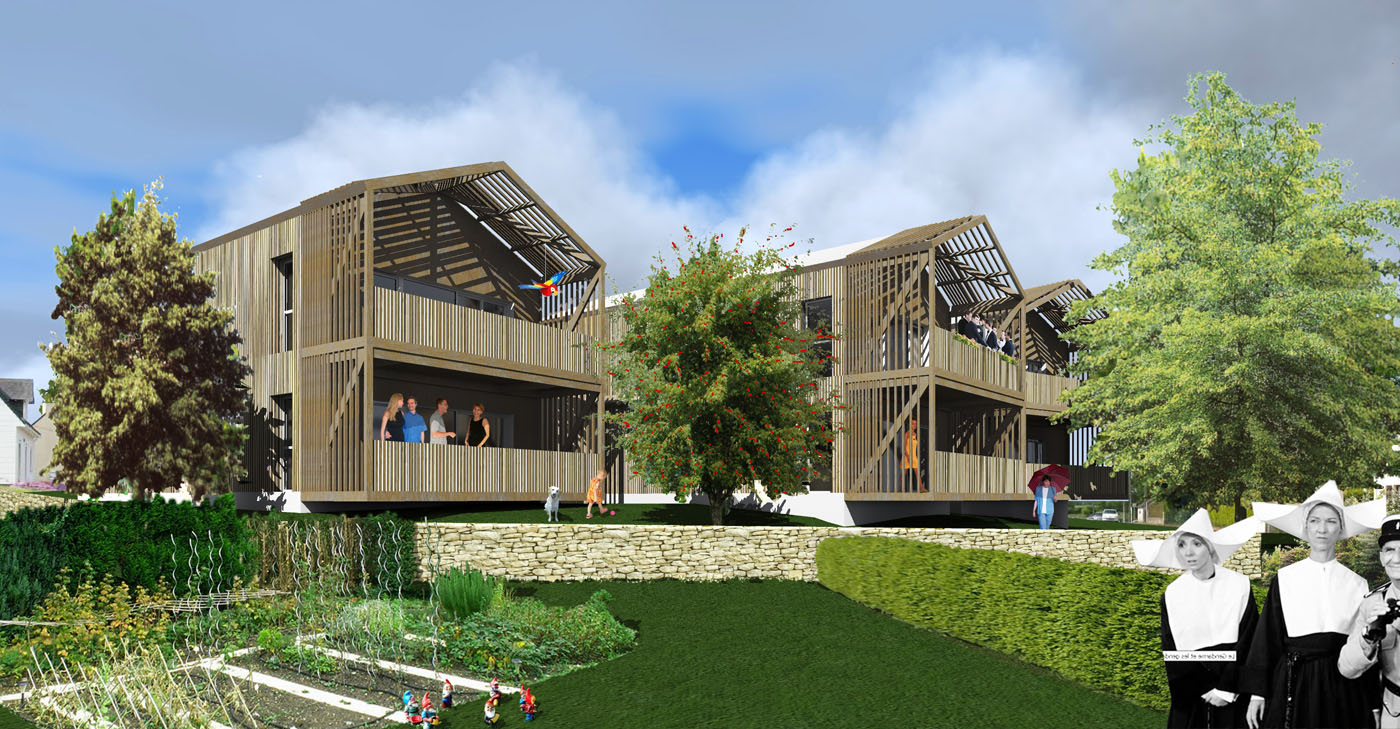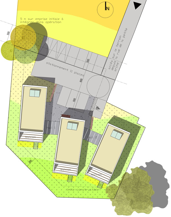 Programme: | 5 logements identiques considérés comme un collectif intégrant des lieux en partage. buanderie, atelier et chambre d'amis. Les 3 lieux partagés devront pouvoir être requalifiés en 1 logement. |