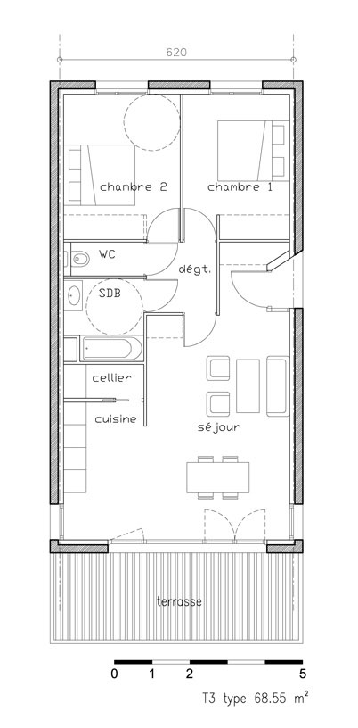 Le plan masse n'a malheureusement pas permis d'installer 5 logements différents typologiquement. Le choix s'est donc orienté vers un module identique mais adaptable aux souhaits des habitants dans le respect des budgets. Les locaux communs complémentaires buanderie / local vélos / bricolage / chambre d'amis, utilisent le volume d'un module du bloc central au RDC. Ce module devant être revendable en appartement en cas de besoin.
