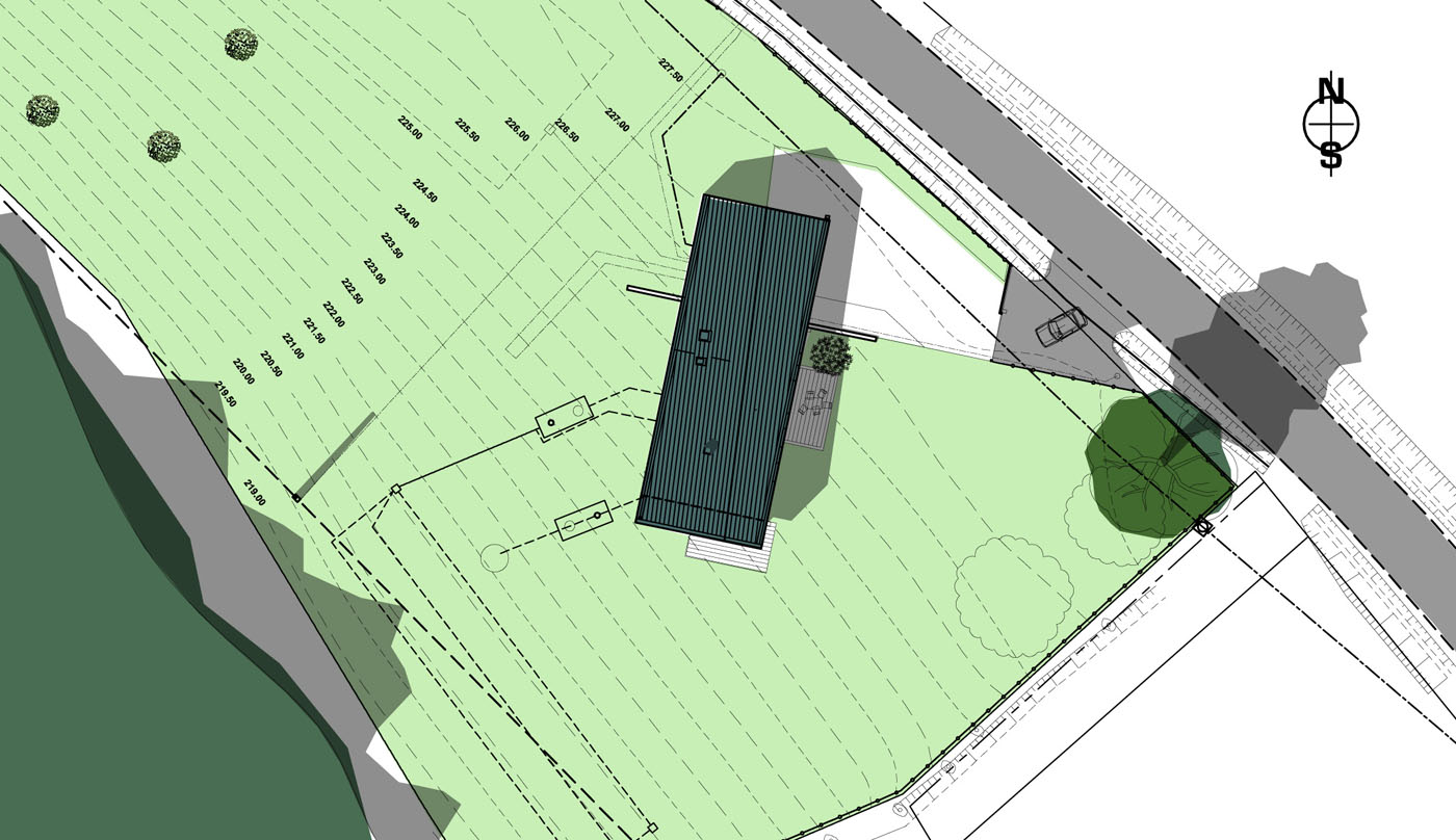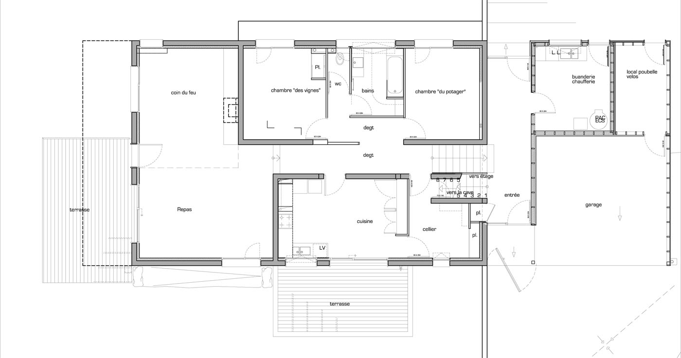 | bioclimatique, RT2005+40%, chauffage PAC et eau chaude par PAC /thermodynamique, récupération des EP pour jardin et WC, bois brut douglas, menuiseries bois brut. | |
