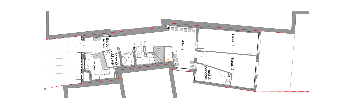 Le programme de cet ERP (etablissement recevant du public) pour l'installation de 5 bureaux de consultation de medecine Générale va s'inscrire au chausse pied dans cette parcelle contrainte toute en longueur.