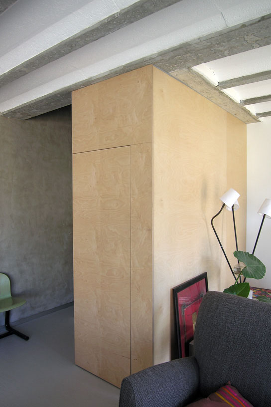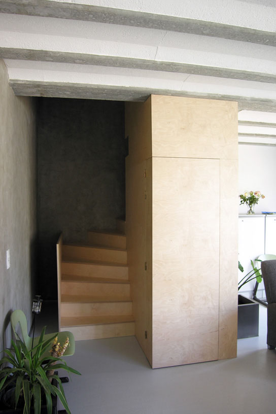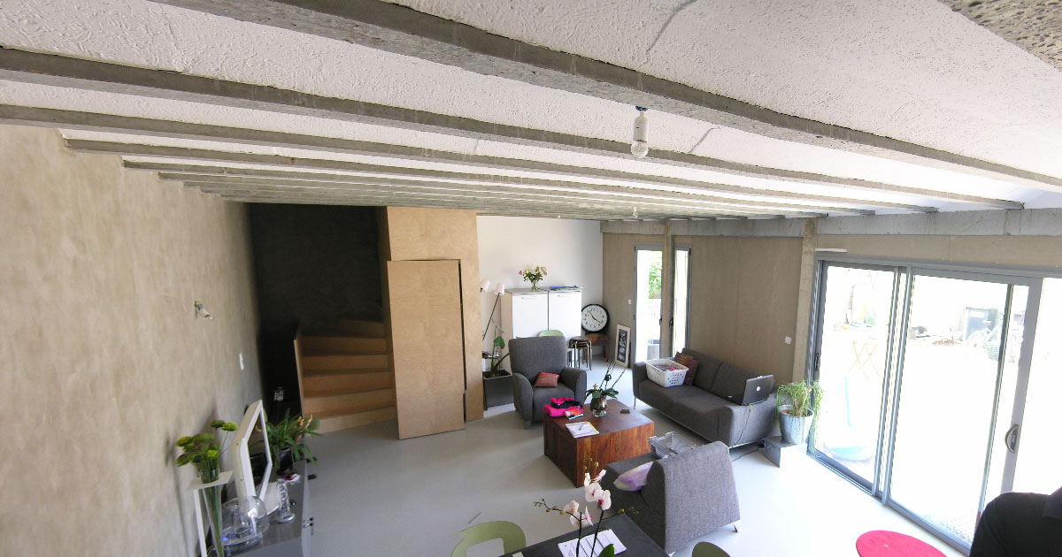 | Une seule façade plein sud à protéger par une isolation doublée en laine de roche. 2 Escaliers en panneaux de peuplier brutes | |