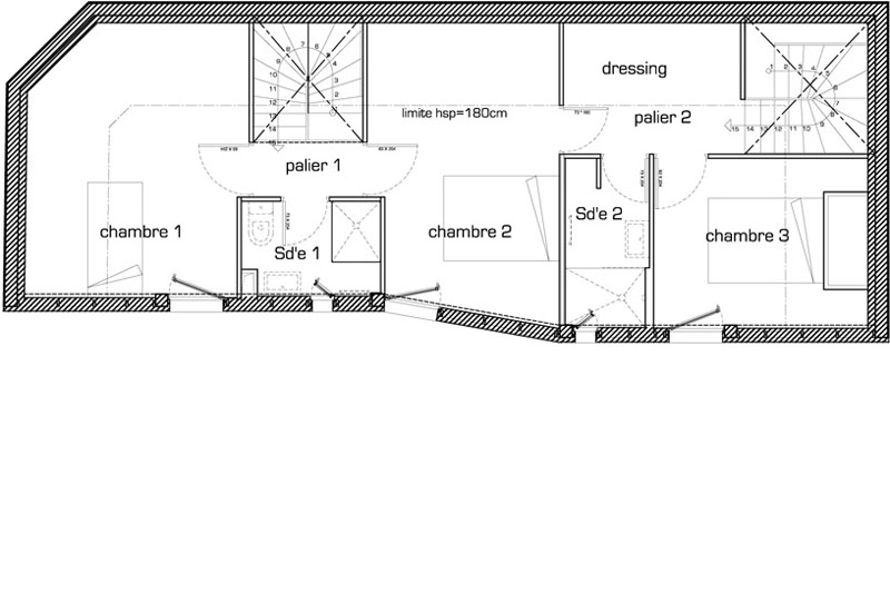 Les 2 escaliers s'expliquent alors par le programme de l'étage "coincé" sous les rampants de la toiture générés par le gabarit. Sans ce doublon, le couloir nécessaire rend impossible le maintien d'une salle d'eau et réduit la surface au sol de la chambre centrale. Les 2 escaliers ne sont donc pas absurdes. Ils apportent en plus l'autonomie parents / enfants et la singularité d'un fonctionnement en boucle.